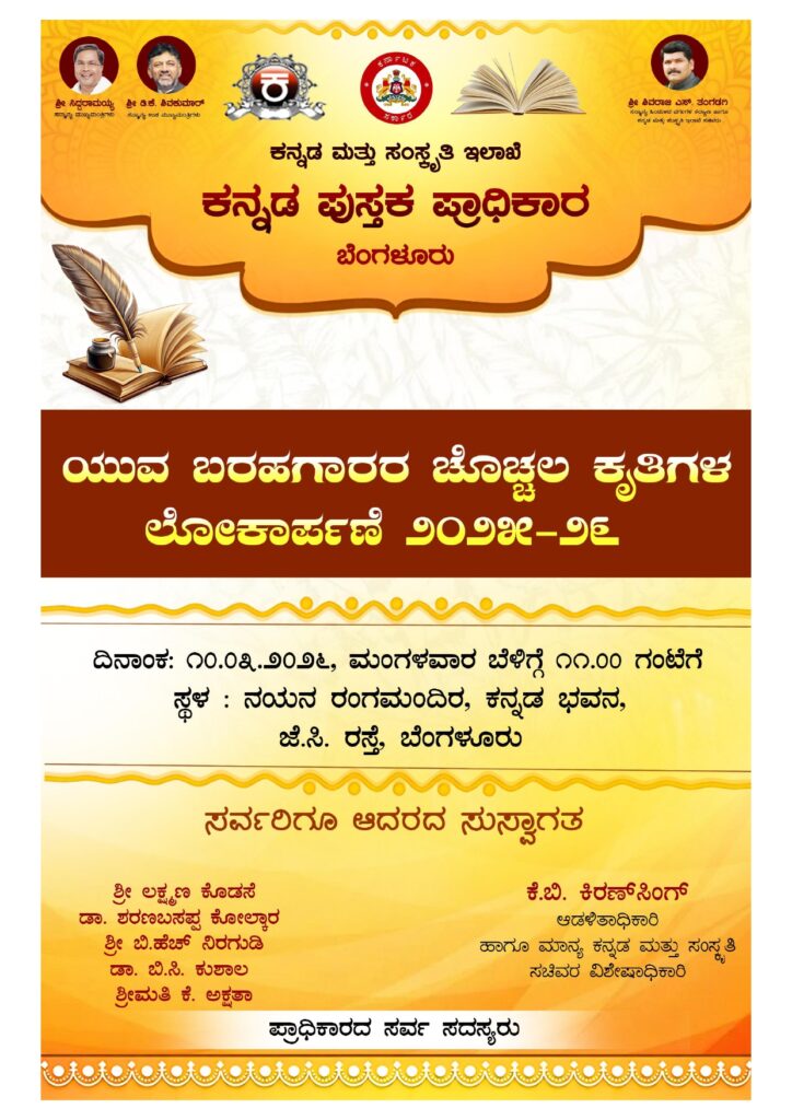 ಕರ್ನಾಟಕ ರಾಜ್ಯ ಸರ್ಕಾರದ ಕನ್ನಡ ಮತ್ತು ಸಂಸ್ಕೃತಿ ಇಲಾಖೆಯ ಕನ್ನಡ ಪುಸ್ತಕ ಪ್ರಾಧಿಕಾರದ 2025-26ನೇ ಸಾಲಿನ ಯುವ ಬರಹಗಾರರ ಚೊಚ್ಚಲ ಕೃತಿಗಳ ಲೋಕಾರ್ಪಣೆ ಇಂದು ಬೆಂಗಳೂರಿನ ಕನ್ನಡ