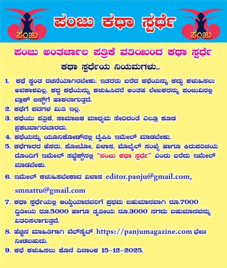 ಜನವರಿ 2026ಕ್ಕೆ 13ನೇ ವಾರ್ಷಿಕೋತ್ಸವದ ಸಂಭ್ರಮದಲ್ಲಿರುವ “ಪಂಜು” ವೆಬ್‌ ಪತ್ರಿಕೆಯು ಕಥಾ ಸ್ಪರ್ಧೆಯೊಂದನ್ನು ಏರ್ಪಡಿಸಿದೆ. ವಿವರಗಳು ಕೆಳಕಂಡಂತಿವೆ.